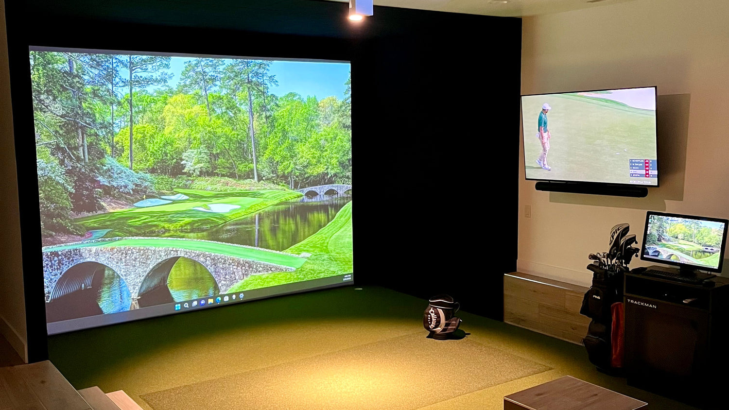 We have partnered with manufacturers and local distributors to keep our prices low so that we can pass those savings on to you. The full set ups include a black out enclosure/wall padding, high impact screen, putting turf, hitting mat, short throw high defintion projector, high speed gaming computer, touch screeen monitor, launch monitor and optional putting holes.
